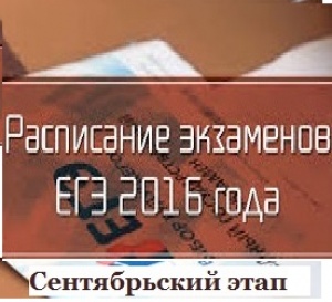 31.08.2016Согласно расписанию проведения единого государственного экзамена и государственного выпускного экзамена, в 2016 году в сентябре экзамены пройдут, ЕГЭ: русский язык – 5 сентября, математика Б – 8 сентября, русский язык, математика – 14 сентября; ГВЭ: русский язык – 5 сентября, математика – 8 сентября, русский язык, математика – 14 сентября; ОГЭ, ГВЭ: математика – 5 сентября, русский язык – 12 сентября, математика, русский язык – 15 сентября.